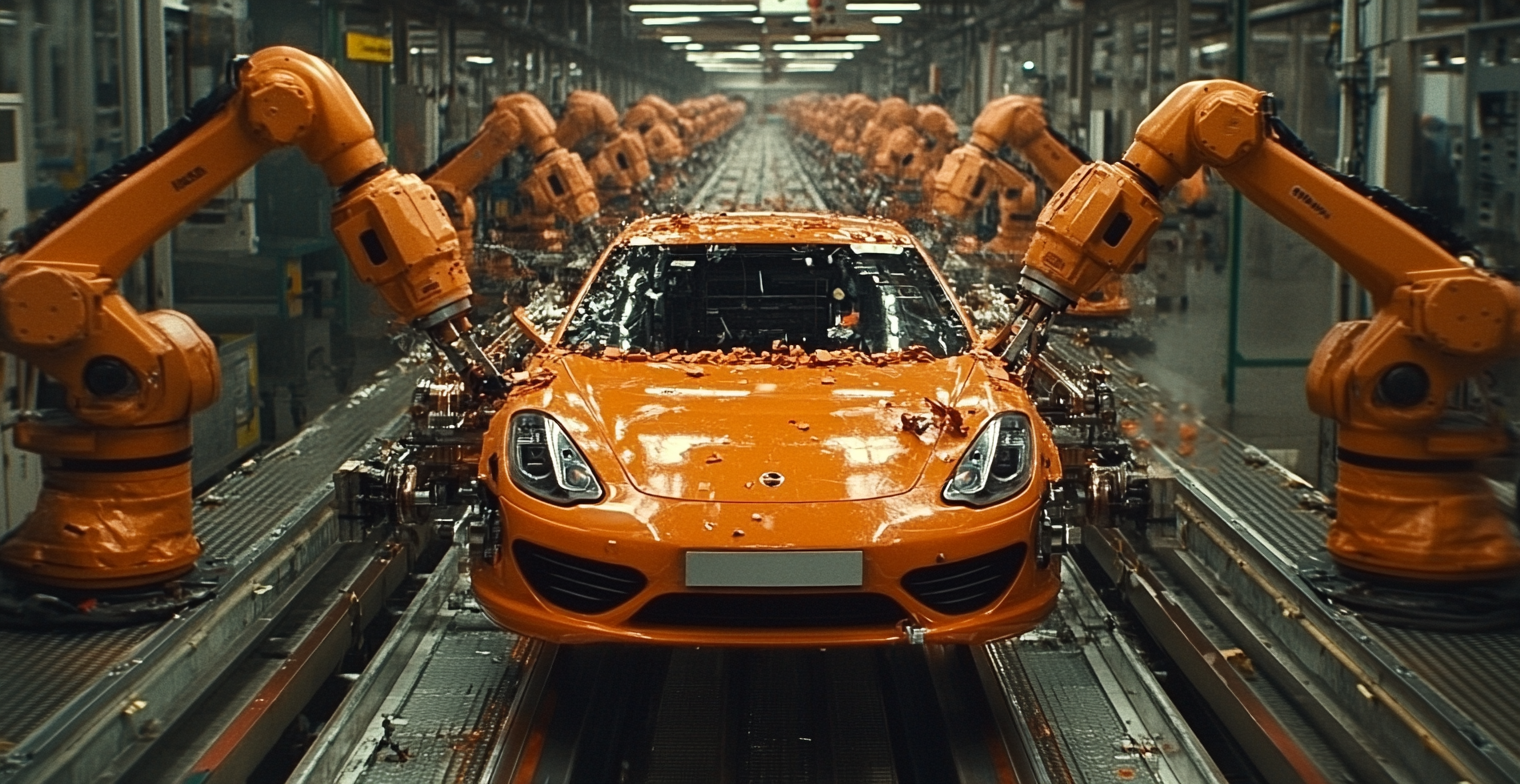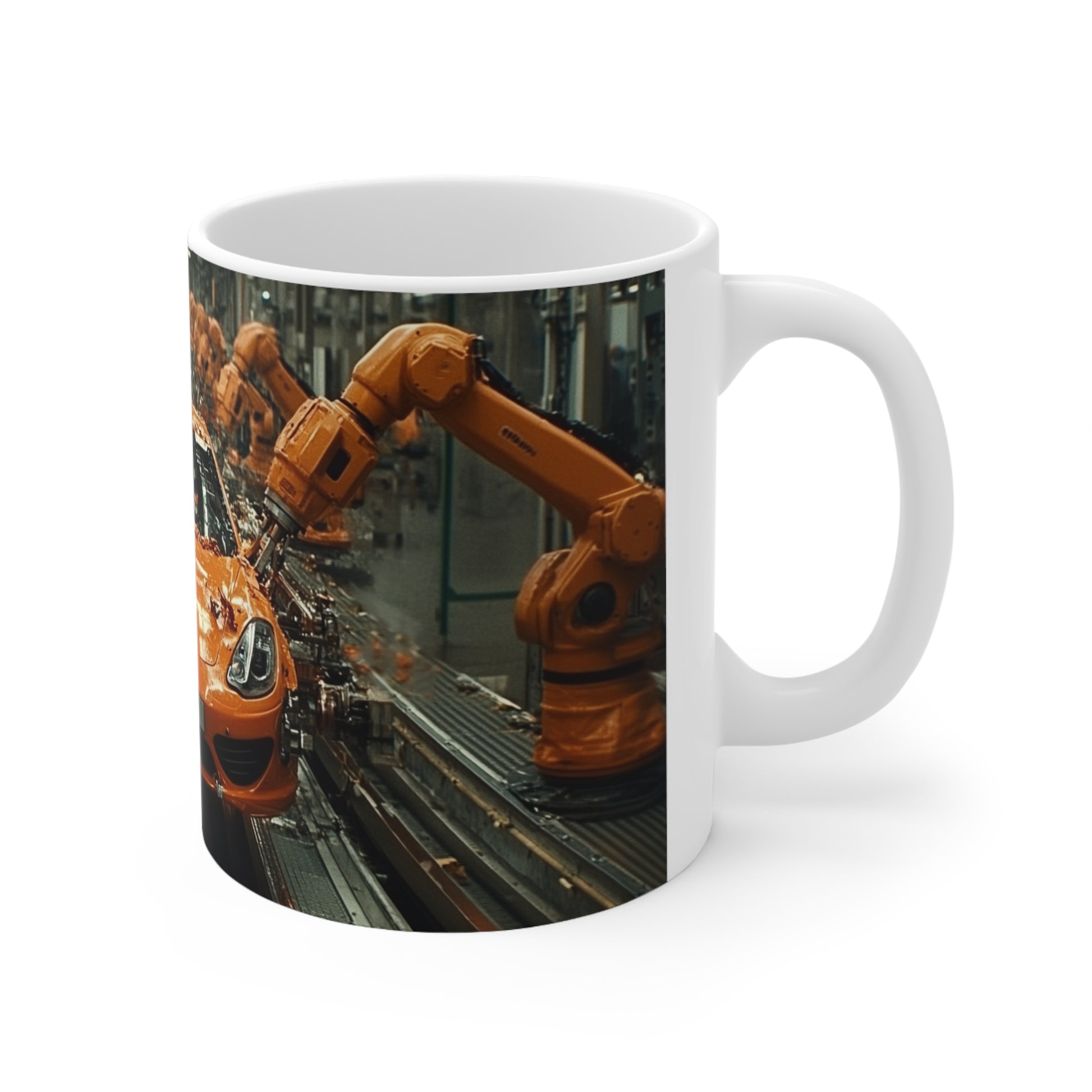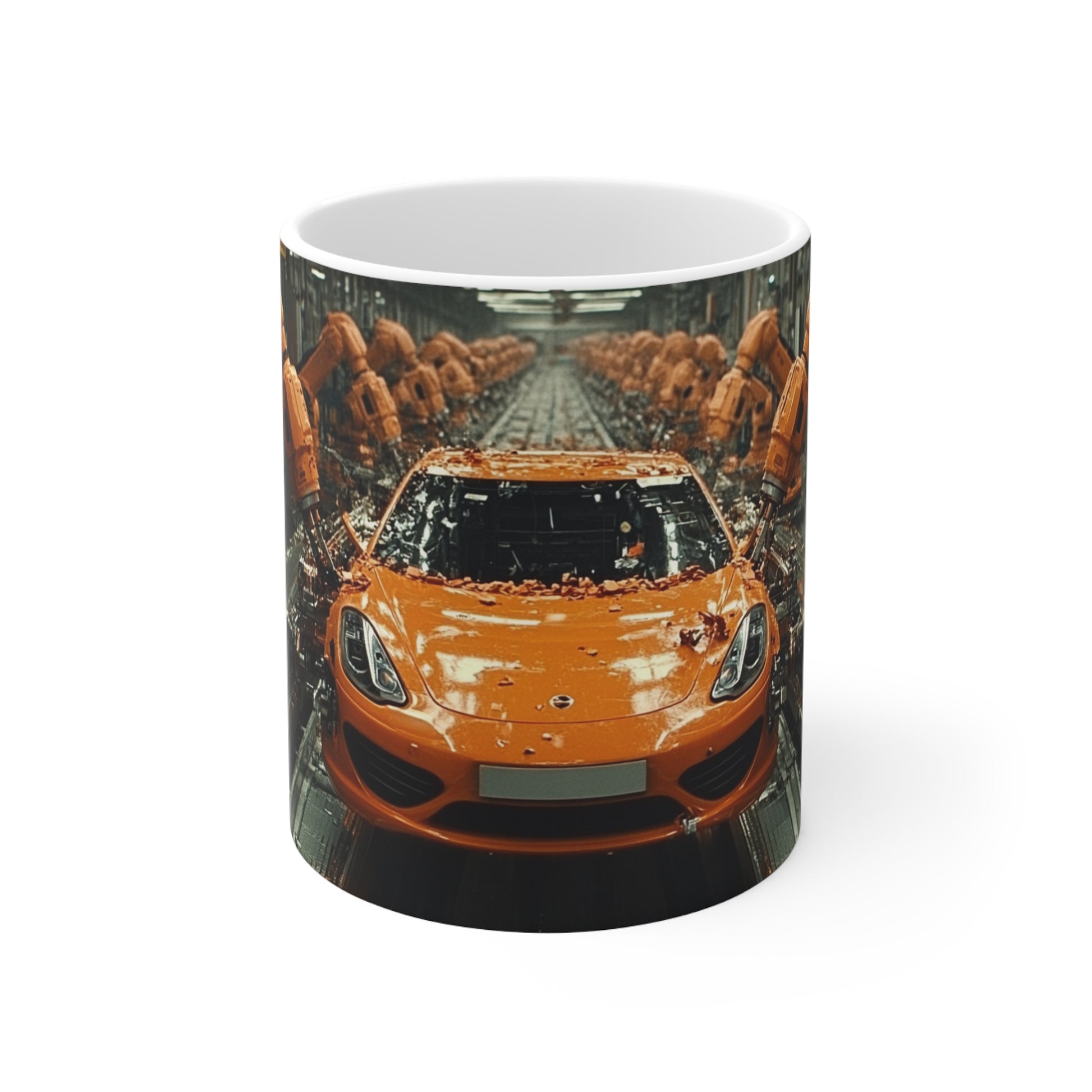 It's all about the custom design when you sell ceramic coffee cups. Create a beautiful, original design, and we'll print them on these cups in picture-perfect quality. An image of an advanced automotive manufacturing process featuring a bright orange car being assembled by multiple robotic arms in a high-tech factory. The scene highlights the efficiency, precision, and technological advancement in modern car manufacturing, showcasing robotics and automation. Ideal for content related to automotive industry innovations, robotic technology, and modern manufacturing processes