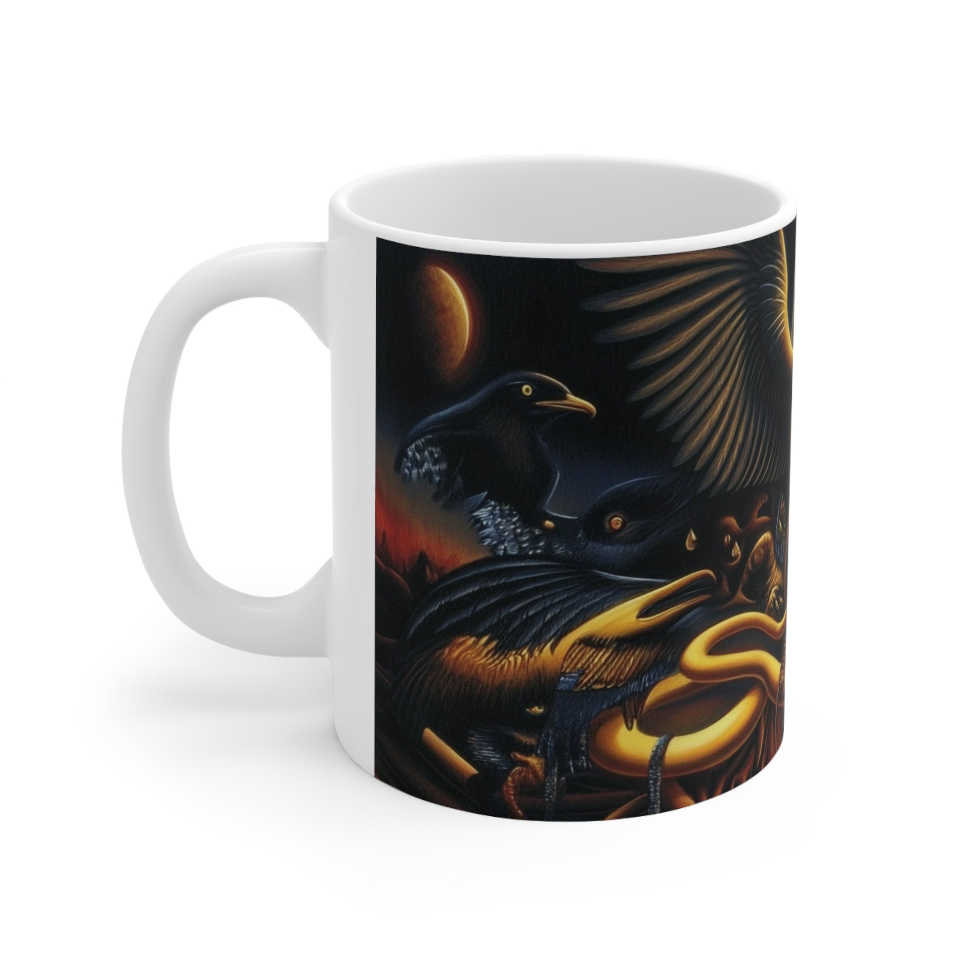 Explore my exclusive collection of coffee mugs featuring surreal and intricate artwork inspired by cosmic and avian elements. Each mug showcases high-quality, vibrant images of an astronaut-like figure surrounded by various birds, including owls and eagles, with fantastical features. The central figure holds a golden, serpentine object that extends outward, adding to the mystical and cosmic atmosphere of the scene. The dark, otherworldly landscape, complete with crescent moons or planets in the sky, enhances the enchanting visual appeal. Crafted from durable ceramic, these mugs ensure long-lasting use and vivid image quality even after multiple washes. Perfect for morning coffee, afternoon tea, or any hot beverage, they bring a touch of imagination and mystery to every sip. Ideal as thoughtful gifts for art enthusiasts and nature lovers, these mugs add a touch of cosmic elegance to any kitchen or office. Celebrate the fusion of human, animal, and cosmic elements with my exclusive collection of surreal-themed coffee mugs, designed to bring joy and inspiration to your everyday moments.