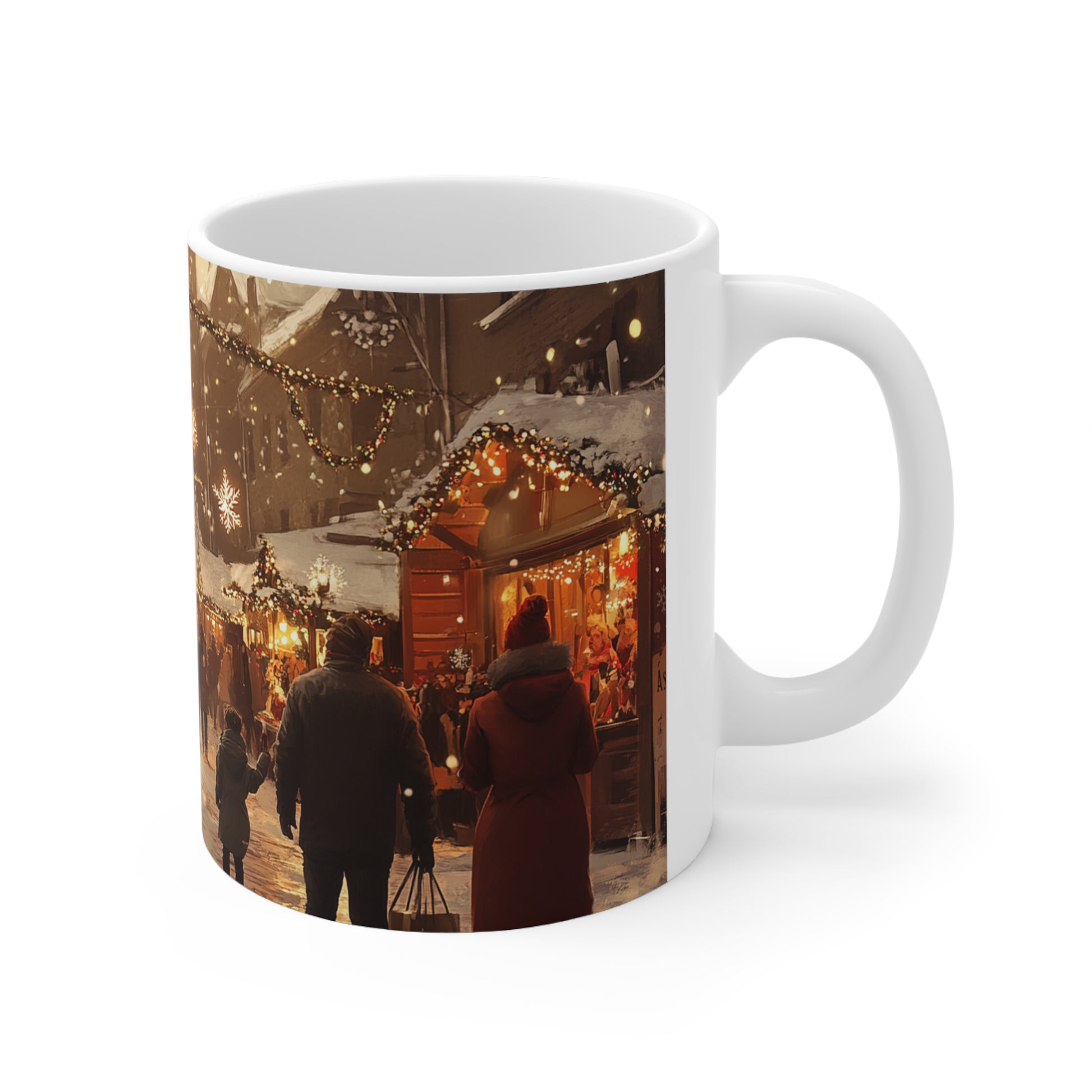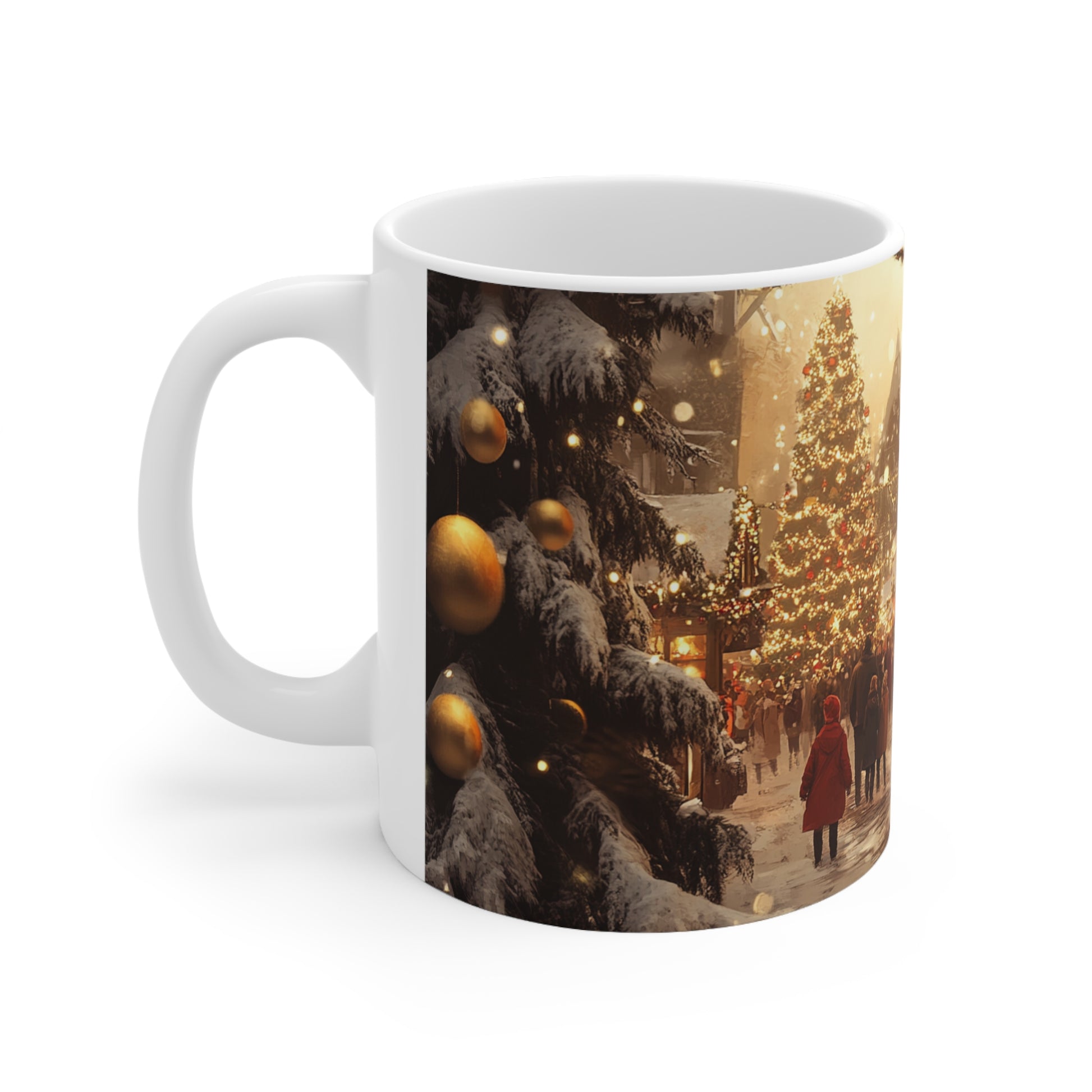 Charming festive Christmas market scene set in a snowy town, bustling with people walking and shopping among beautifully decorated stalls. A large, illuminated Christmas tree stands prominently in the centre, adorned with lights and ornaments. Snow-covered buildings and trees, along with strings of lights and snowflake decorations, create a warm and festive atmosphere. This image captures the essence of a traditional holiday market, perfect for promoting holiday festivities and seasonal events.