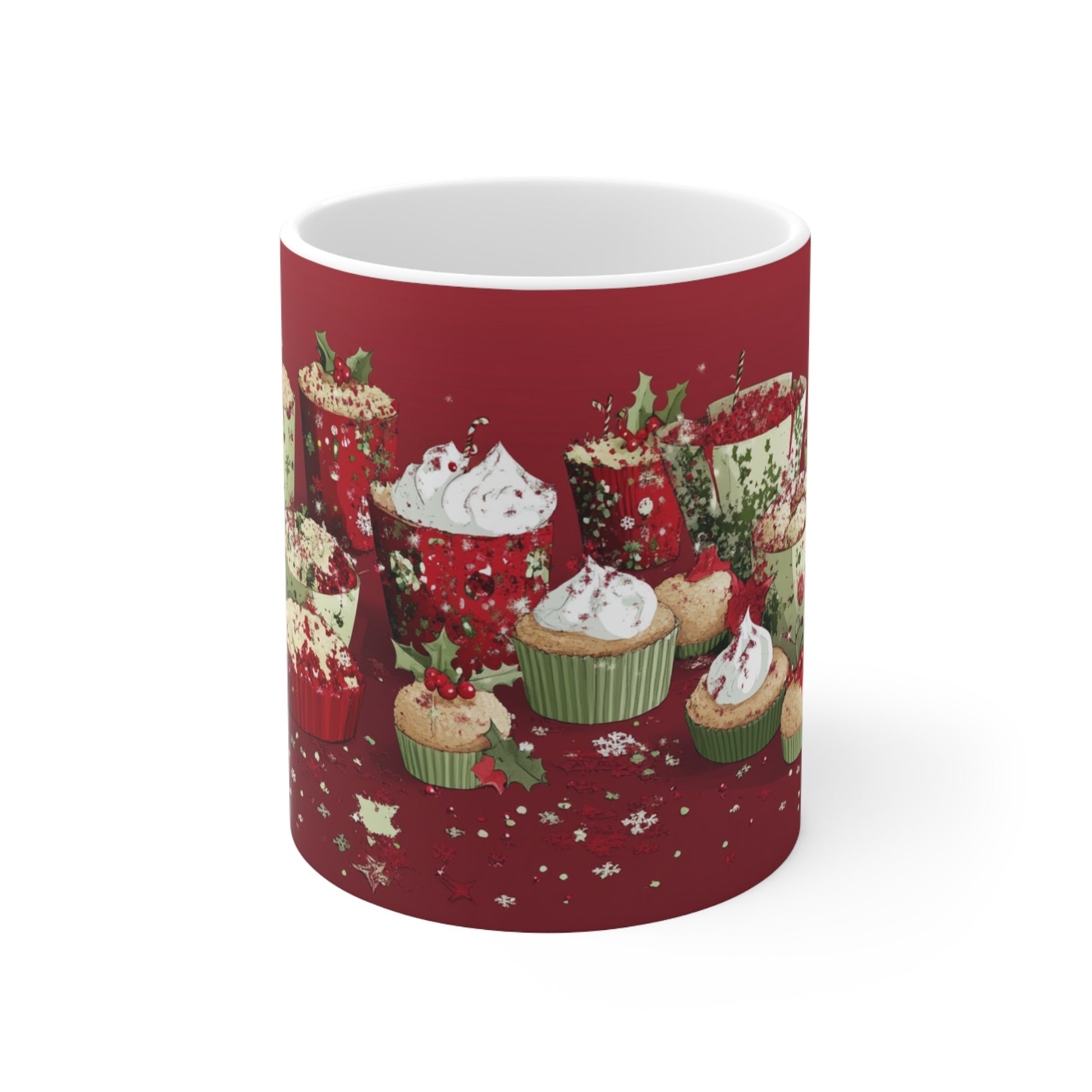 Festive assortment of cupcakes and muffins decorated with holiday-themed toppings and wrappers. Adorned with red and green decorations such as holly leaves, berries, and sprinkles, some cupcakes feature whipped cream toppings. The wrappers showcase Christmas-themed patterns like snowflakes and ornaments, set against a gradient red background, enhancing the holiday spirit. Perfect for holiday baking enthusiasts, festive recipe blogs, or seasonal marketing campaigns.
